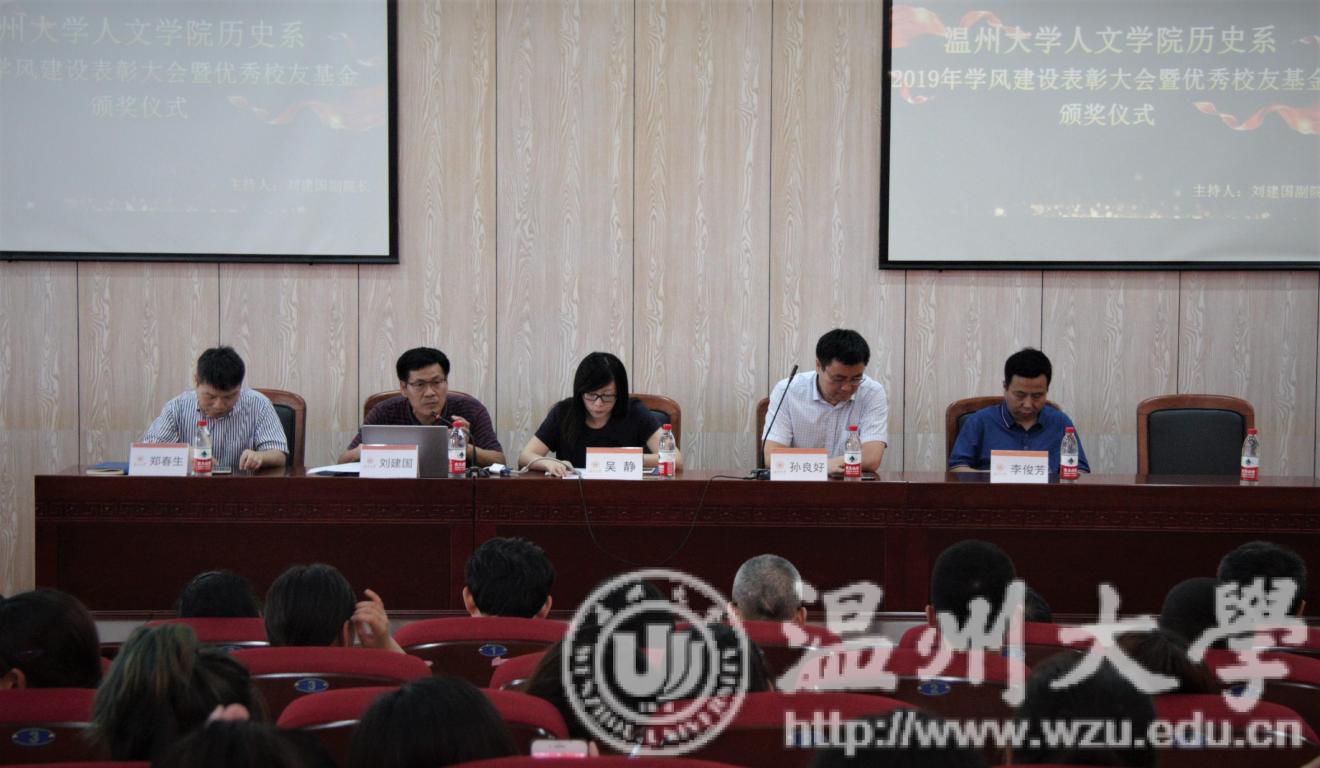 2019年6月18日下午,球探体育 历史系2019年学风建设表彰大会暨优秀校友基金颁奖仪式于人文楼203会议室举行。球探体育 院长孙良好、党委书记吴静、副院长郑春生、系主任李俊芳以及全体历史系教师和学生出席。球探体育 刘建国副院长担任主持人。