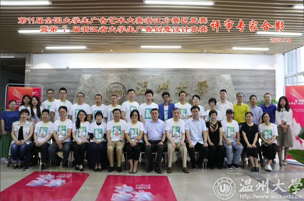 本次评审工作持续2天,全国大学生广告艺术大赛组委会秘书长刘瑞武、上海师范大学人文与传播学院金定海教授、中国传媒大学张翔教授、中央民族大学沈虹教授、浙江大学传媒与国际文化学院胡晓云教授等20位学界和业界的专家等20余位学界和业界的专家评委专家们在7号晚上就开始初审工作, 8号则是入围比赛选手答辩评审工作。 8号上午温州大学薛伟副校长视察答辩评审工作并和评委合影留念。