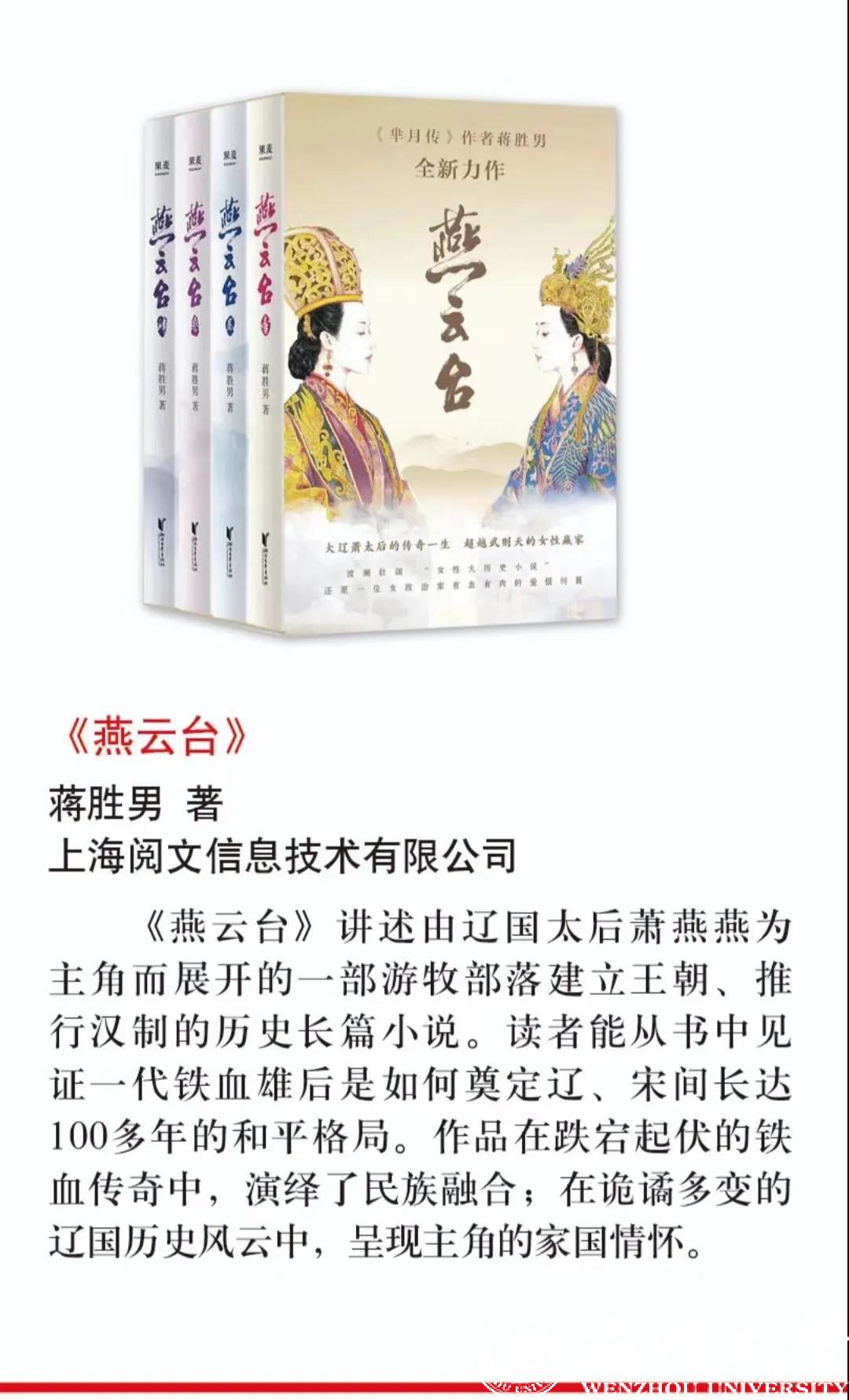 4月23日,在“2019年度中国好书”的评选中,由我校球探体育 蒋胜男研究员所著、浙江文艺出版社出版的《燕云台》荣膺网络文学类“2019年度中国好书”荣誉。