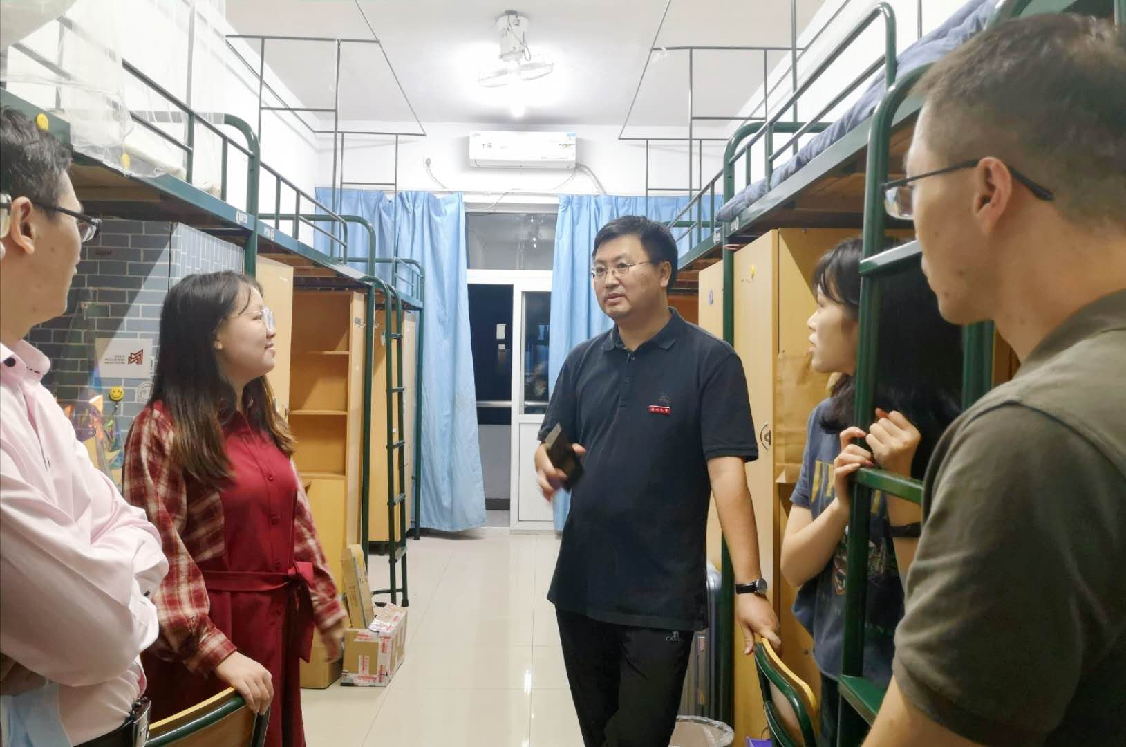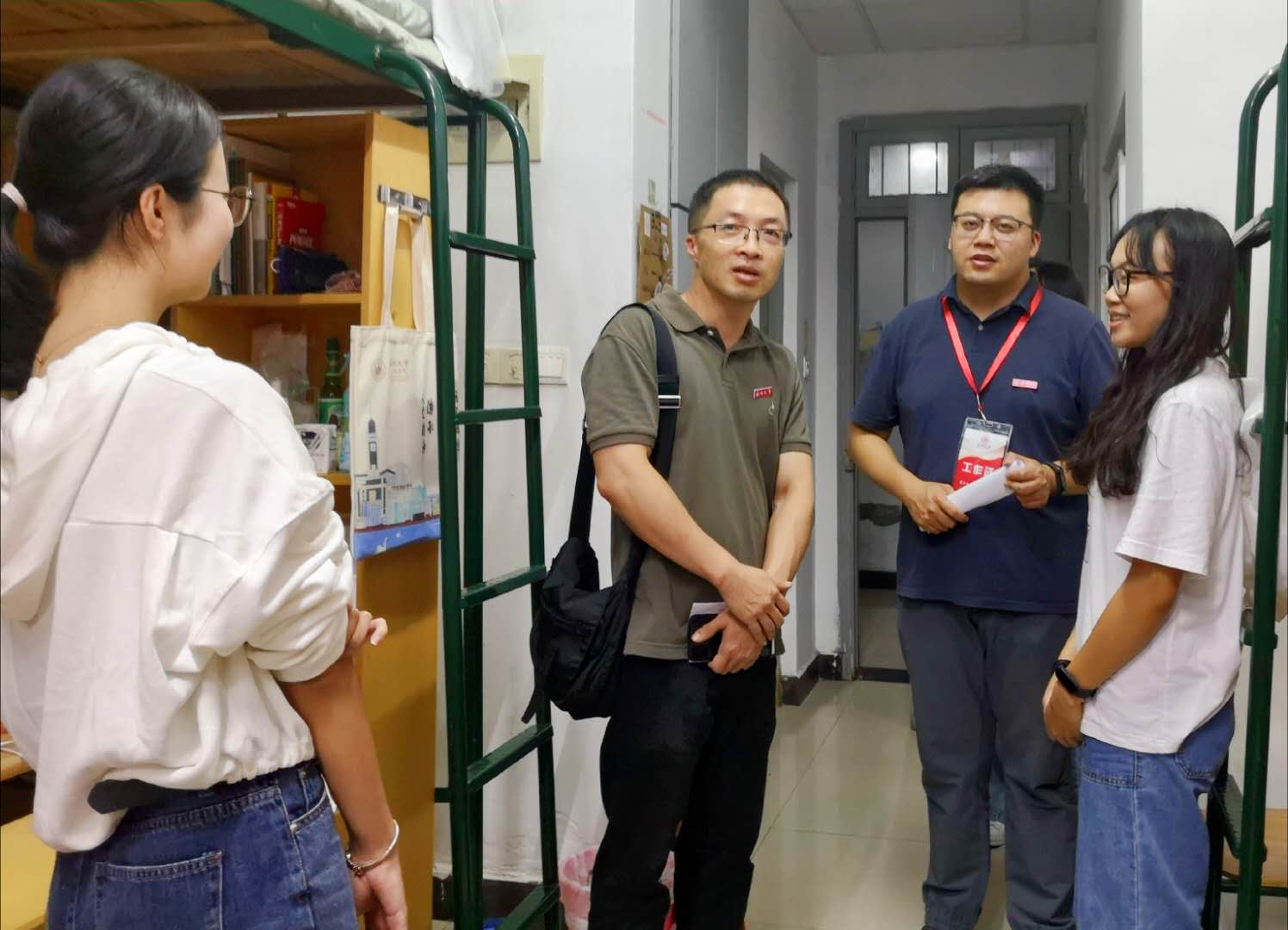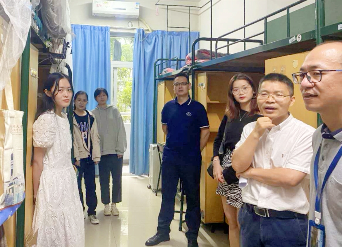 球探体育 领导非常关心新生报到后的生活适应情况,25号,院长孙良好、院党委书记吴静、副院长郑春生、院党委副书记魏一、副院长陈源源、张真老师携辅导员、班主任逐一走访全体新生寝室。在深入走访过程中,就新生的饮食、住宿、环境等问题进行了细致地询问。学院党委书记吴静关心学生选择专业的初衷与对未来的规划,她建议新生同学做好职业规划,积极尝试大学生活的各种活动,并希望同学们在后续生活里奋发有为,积极进取,彼此互帮互助,营造良好的学习环境。