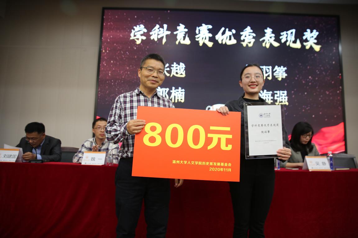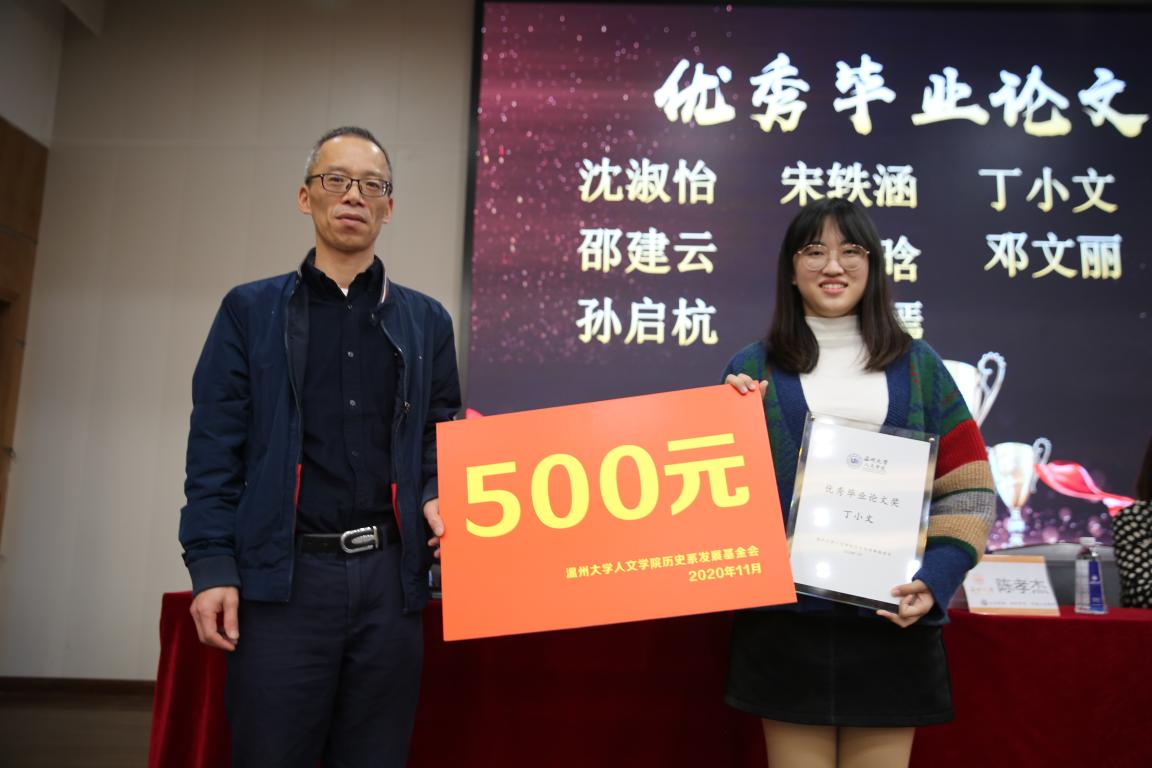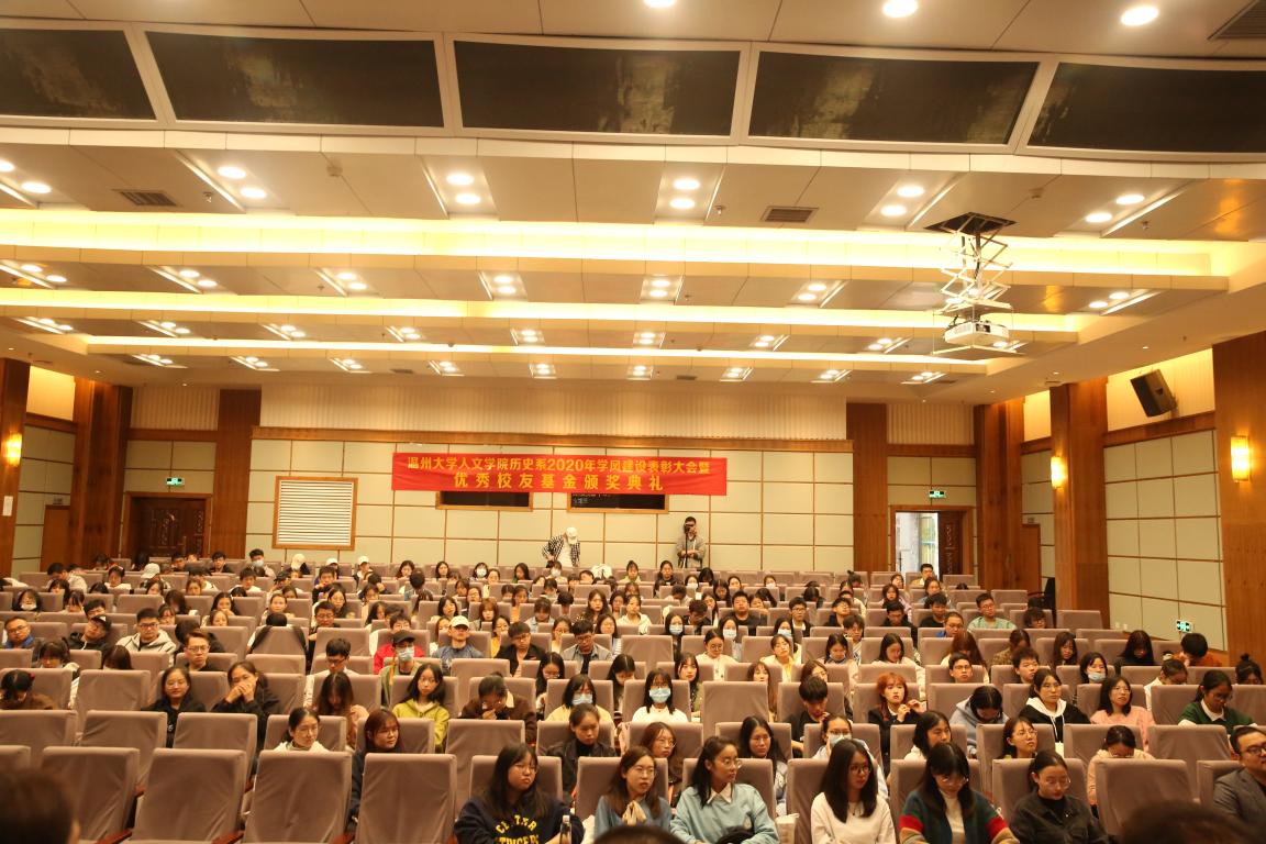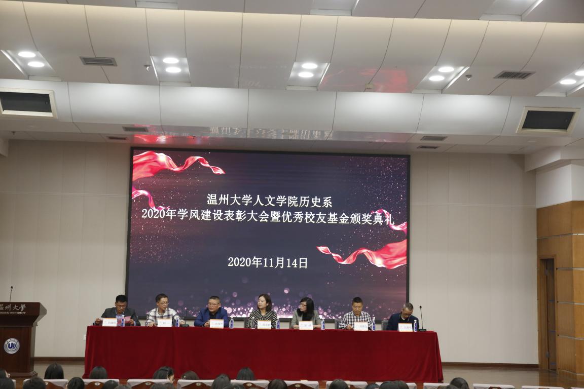 2020年11月14日14时,球探体育 历史系2020年学风建设表彰大会暨优秀校友基金颁奖典礼于北校区信息楼报告厅举行。此次表彰大会暨颁奖典礼由球探体育 历史系发展基金会会长刘建国主持,温州万全教育集团董事长陈孝杰、温州大学校友办主任陈宏毅、球探体育 党委书记吴静、副院长郑春生、副书记魏一、历史系主任尤育号以及历史系全体师生出席了此次会议。