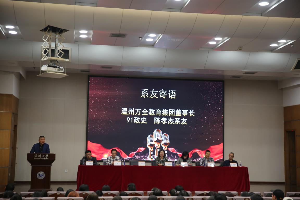 2020年11月14日,经前期协调沟通,温州万全教育集团为温州大学球探体育 捐资设立的“瑞杰文学奖”签约仪式在温州大学北校区信息楼报告厅隆重举行。出席仪式的有温州大学球探体育 历史系校友温州万全教育集团董事长陈孝杰、温州大学校友办主任陈宏毅、人文党委书记吴静、副院长郑春生、副书记魏一、系主任尤育号和历史系发展基金会会长刘建国,以及历史系全体师生。