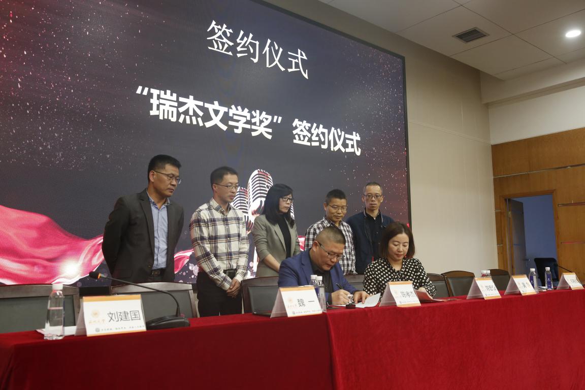 此次“瑞杰文学奖”是温州大学球探体育 历史系校友陈孝杰先生为支持温州大学教育发展,鼓励温州大学球探体育 学生奋发向上,大胆追求自己的文学梦想,促进学生专业能力的发展,同时激发出众多文学爱好者们强烈的创作激情特捐资15万元设立“瑞杰文学奖”专项奖学金,用于奖励温州大学具有文学特长学生,以及推动球探体育 学生文学创作发展所需的资金。仪式上温州万全教育集团董事长陈孝杰与校友办主任陈宏毅共同签署了合作协议。