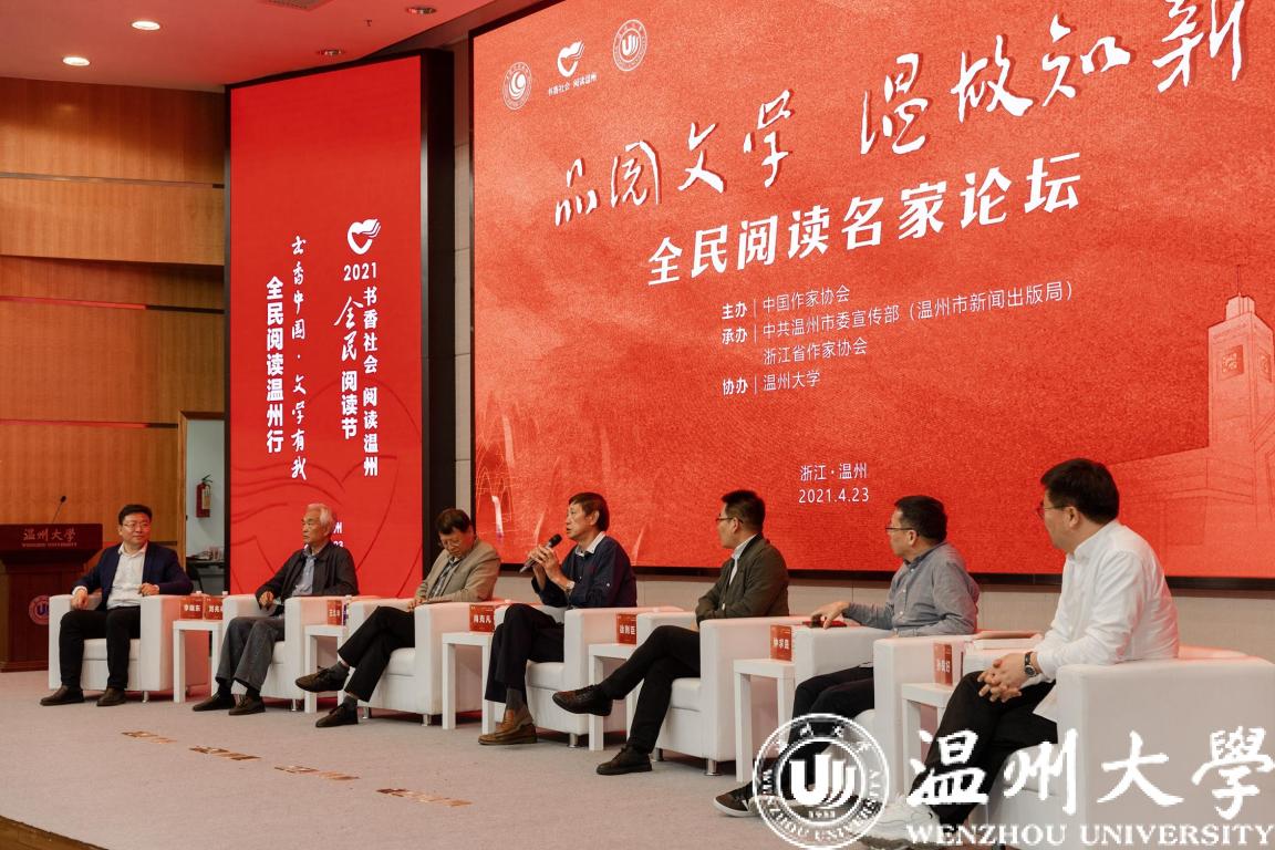 四月芳菲好,读书正当时,4月23日下午,2021年“书香中国 文学有我”全民阅读温州行重磅活动“品阅文学 温故知新”全民阅读名家论坛在温州大学举行。中国作协书记处书记邱华栋、中国作协社联部副主任李晓东、中共温州市委常委宣传部部长胡剑谨、温州大学党委书记谢树华、中国作协社联部二级巡视员丰玉波、浙江省作协党组成员、秘书长晋杜娟,中共温州市委宣传部副部长、市新闻出版局局长梅阳,温州大学党委委员、宣传部部长潘玉驹等领导嘉宾出席本次论坛。此外现场参与的观众有中国作家协会代表、温州市作家协会代表、温州市读者代表、我校师生代表等。