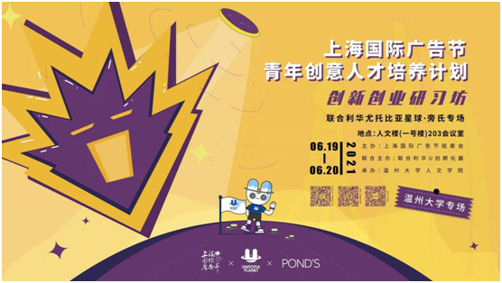 本次在温州大学举办的创新创业研习坊,将由联合利华旁氏品牌、电通麦利博文、埃森哲互动与光弧科技的讲师们为温大学子带来专题培训课和专题讲座,话题围绕新消费趋势下的品牌发展、数字时代的品牌数字资产建设以及品牌创意等内容展开。温州大学共派出12支由48位同学组成的创新团队进行培训和创意实训PK。在培训前两周,已布置研习坊成员提前准备课题,专业老师进行线上答疑。19日,进行开班仪式、专题培训课以及1V1答疑课,更有针对性地解决学生的专业问题,同时进一步发掘具有潜力的青年创意人才。20日,开展提案分析课以及颁发学员证书及奖励。联合利华也将为学员提供直接参加2022年管理培训生或暑期实习生终面green pass的名额。