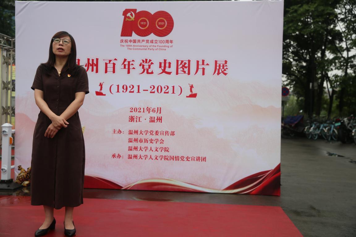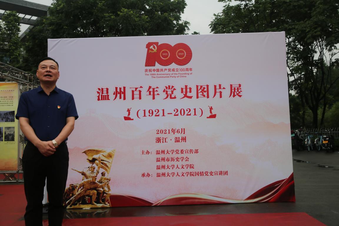 为庆祝中国共产党成立100周年,由温州大学党委宣传部、温州市历史学会、温州大学球探体育 联合主办,温州大学球探体育 国情党史宣讲团承办的“温州百年党史图片展(1921-2021)”于6月22日在温州大学育英图书馆前开幕。校党委委员、宣传部部长潘玉驹,球探体育 党委书记吴静、党委副书记魏一、历史系教授刘建国及师生党员代表等出席。