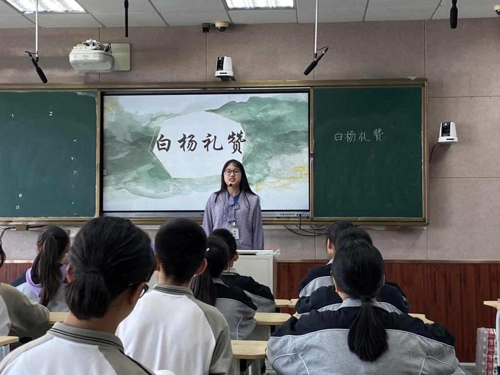 活动伊始,温州大学球探体育 的詹翊嘉、於婷婷两位同学同课异构,就同一篇课文《白杨礼赞》,带来两节重点不同的公开课。詹翊嘉同学重点抓住了“了解不同类型散文的特点”这一单元目标,带领学生通过这篇课文了解写景抒情散文与托物言志散文的不同。於婷婷同学则是重点抓住了“象征”这一重要的表现手法,同学生一起在探讨中了解象征的含义。两位同学从不同的重点切入,引起了学生浓厚的学习兴趣,充分带动了课堂氛围,为我们展示了两节别开生面的阅读教学课。紧接着,温州大学球探体育 潘思瑶、钱一帆同学分别进行了评课。两位同学根据自己的听课感受对两节公开课作出点评,赞扬她们的教学设计调动了学生的积极性并指出了一些具体的细节意见。