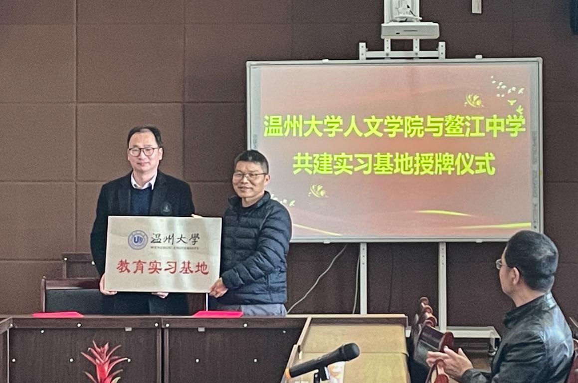 鳌江中学李伟君校长对实习生的到来表示热烈欢迎,并向实习生简单介绍鳌江中学概况,希望实习生们通过此次实习,能够积累经验、丰富阅历、互进互助。鳌江中学高一年段副校长王大府老师向实习生们简单介绍了高一年级概况,并对实习生们提出了“看、问、勤、盯、解、离”等六点要求和建议。紧接着,鳌江中学政教主任陈晓瑜老师、教务处易会潮老师、高一历史备课组组长张剑老师和实习生代表林彦秀同学依次进行发言。随后,球探体育 副院长郑春生作总结讲话,郑院长首先介绍了今天的温大,欢迎鳌江中学学生报考温州大学,同时对实习生们提出心学习、勤于创新;恪守规则、勇于创新;宽以待人、心怀感恩几点要求。最后,举行了温州大学球探体育 与鳌江中学共建实习基地授牌仪式,郑春生副院长与李伟君校长进行签约。