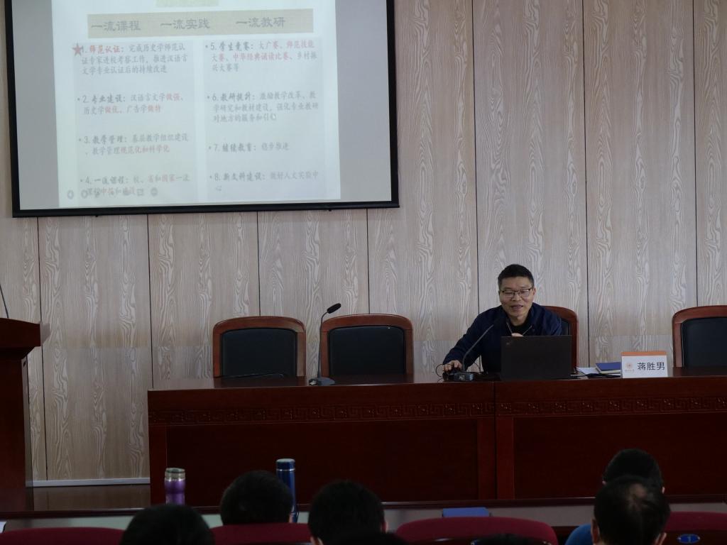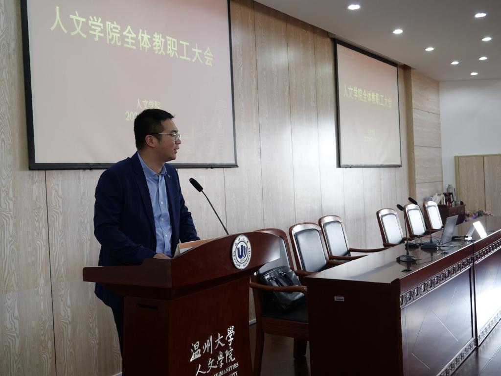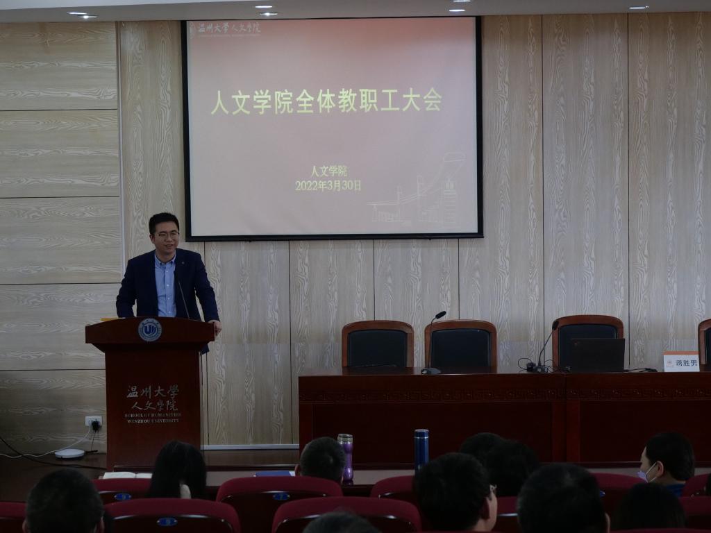 3月30日下午,球探体育 于人文楼203报告厅召开了全体教职工大会暨理论学习会,会议由学院党委书记江秀景主持,学院领导班子和全体教职工参加会议。