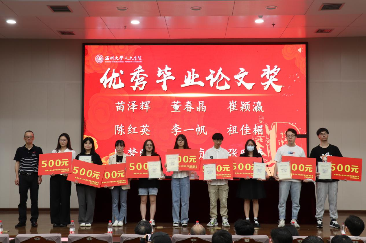 刘建国老师回顾了历史系表彰大会的发展过程,介绍了到场嘉宾。尤育号老师为大家解读了《温州大学球探体育 历史系发展基金使用方法》,并对给予捐赠的校友表示感谢,希望基金能帮助更多优秀的历史系师生,助力历史学科进一步发展。颁奖环节由魏一副书记宣读获奖名单,奖项有优秀毕业论文奖、优秀学术成果奖、优秀学科竞赛奖、考研考博贡献奖和教师特别贡献奖。获奖学生依次上台领奖。郑春生老师获教师特别贡献奖,由肖心蕊同学代为领奖并发表获奖感言。郑春生老师表达了在从教三十年之际获得此项荣誉的激动之情,并希望能与诸君共勉,在生活与工作中坚持不懈地去追求“凡人”的成功和幸福,在不远的未来为历史系、球探体育 ,乃至温州大学做更多贡献。