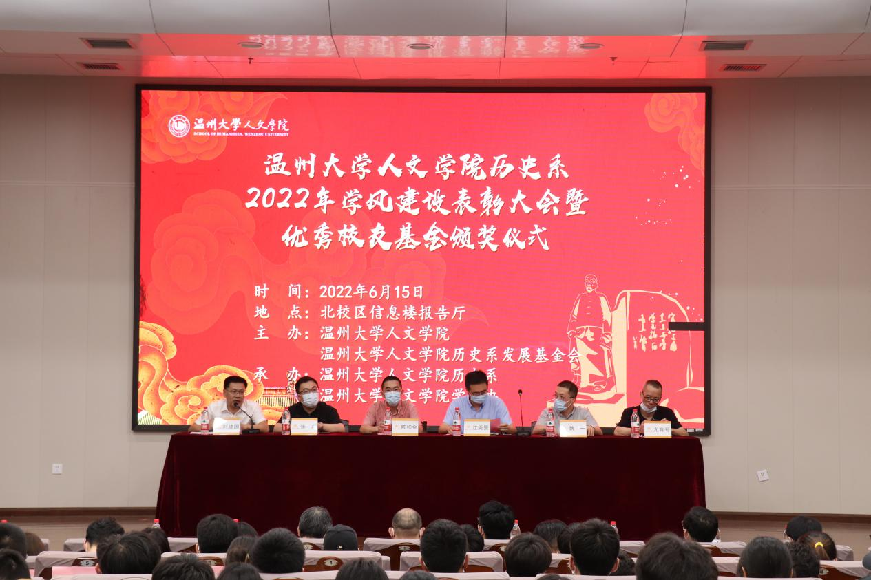 2022年6月15日,球探体育 历史系2022年学风建设表彰大会暨优秀校友基金颁奖仪式于北校区信息楼报告厅举行。大会由球探体育 历史系发展基金会会长刘建国主持,院党委书记江秀景、副书记魏一、张真老师、历史系主任尤育号、93政史校友陈积金以及历史系全体师生出席了此次会议。