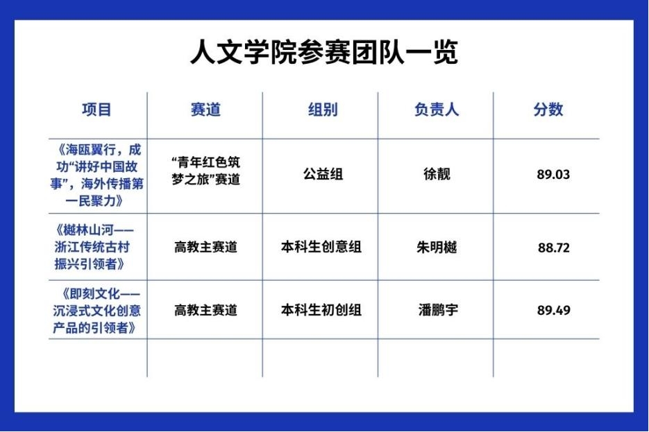 3支队伍从7月开始进行集中备战,前往杭州进行线下路演答辩,分别是:《海瓯翼行,成功“讲好中国故事”,海外传播第一民聚力》《樾林山河——浙江传统古村振兴引领者》《即刻文化——沉浸式文化创意产品的引领者》。