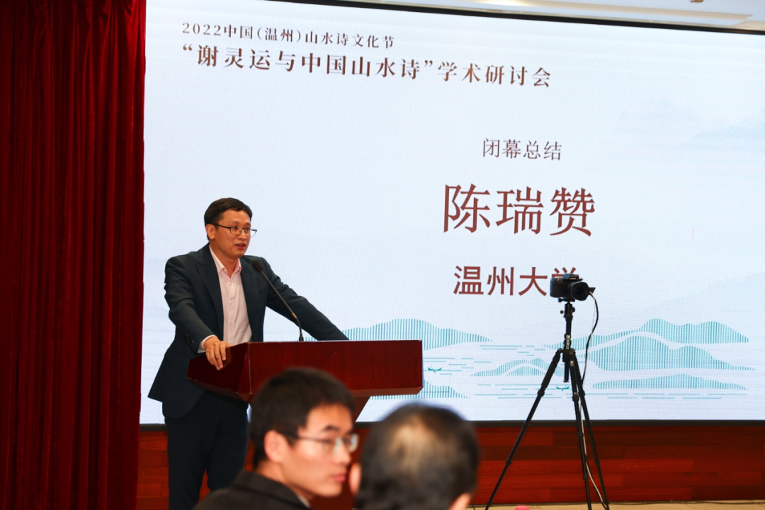 最后,“中国山水诗研究”课题首席专家、温州大学研究员陈瑞赞做闭幕总结,他表示,温州山水诗是一个很重要的文化题目,从此次举办“谢灵运与中国山水诗”主旨论坛暨学术研讨会的情况来看,山水诗研究对于国内外学术界都具有强大的吸引力。温州大学“中国山水诗研究中心”承载着瓯江山水诗路建设的重任,期待在疫情后、蓝天下、山水间,与更多的学者再次相约!