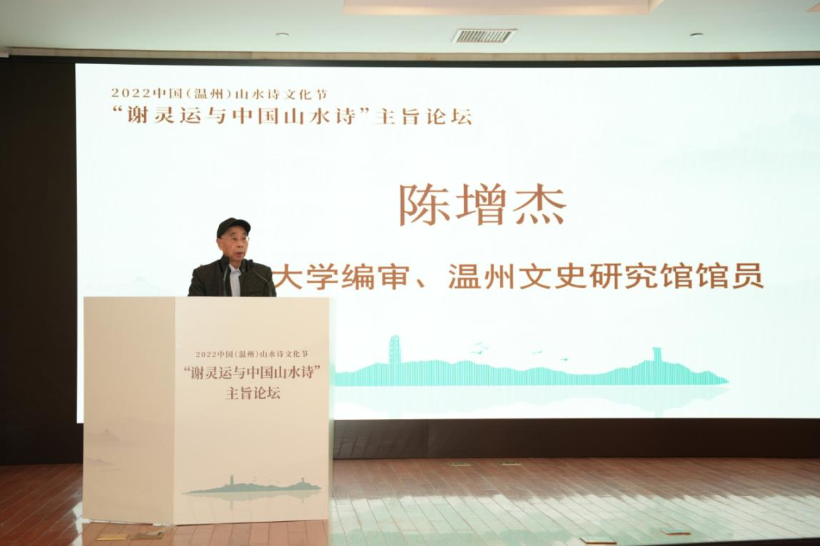 温州大学编审、温州文史研究馆馆员陈增杰最后阐述了《谢灵运留给温州的诗学遗产》。他指出,中国诗歌史上创作诗风的这一重大转变,是谢灵运在温州完成的。同时,他还强调,谢灵运留给温州丰富且极具价值的诗学文化遗产,包括塑造永嘉山水“灵秀”的形象、赋就永嘉山水名城的荣誉和山水诗发源地的地位、奠定谢灵运山水诗的基调和总体风格以及对永嘉诗风的启发培育之功,影响巨大而深远。