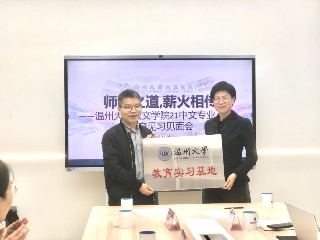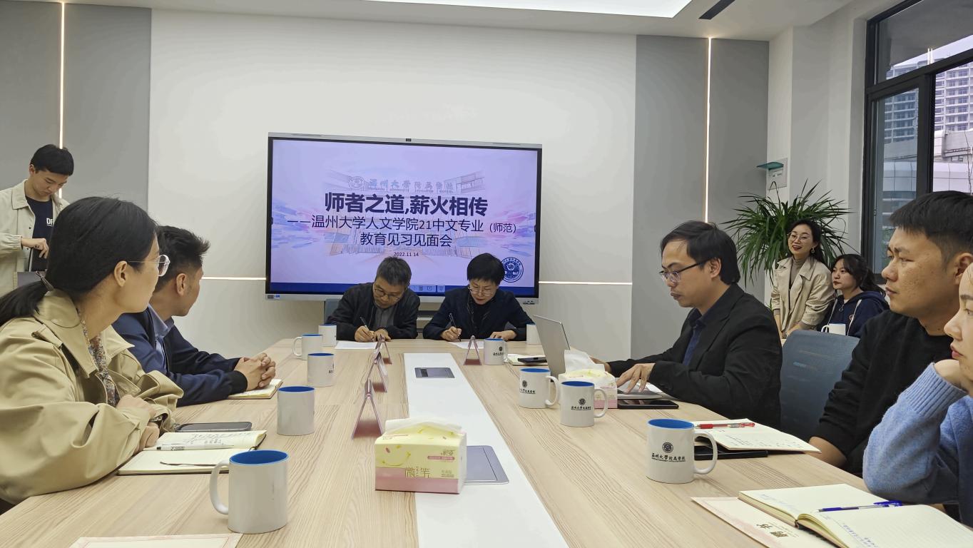 2022年11月14日,温州大学球探体育 与温州大学附属学校(温州榕园学校)实习基地签署仪式暨21级汉语言文学(师范)教育见习见面会在温州大学附属学校办公楼二楼会议室举行。参加本次见面会的有温州大学附属学校屈小武校长、各学科和班主任导师,温州大学球探体育 郑春生副院长、中文系主任鲍良兵老师和系副主任余琼老师,以及温州大学球探体育 21级汉语言文学(师范)专业15名见习生。