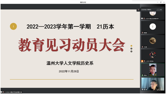 2022年11月28日球探体育 21级历史系教育见习动员大会在线上召开。会议由杨持美同学主持,来自21级历史系的同学们和温州大学球探体育 副院长郑春生老师、历史系主任尤育号老师、阙仁镇老师、王鹏老师、王印老师参与了本次动员会。