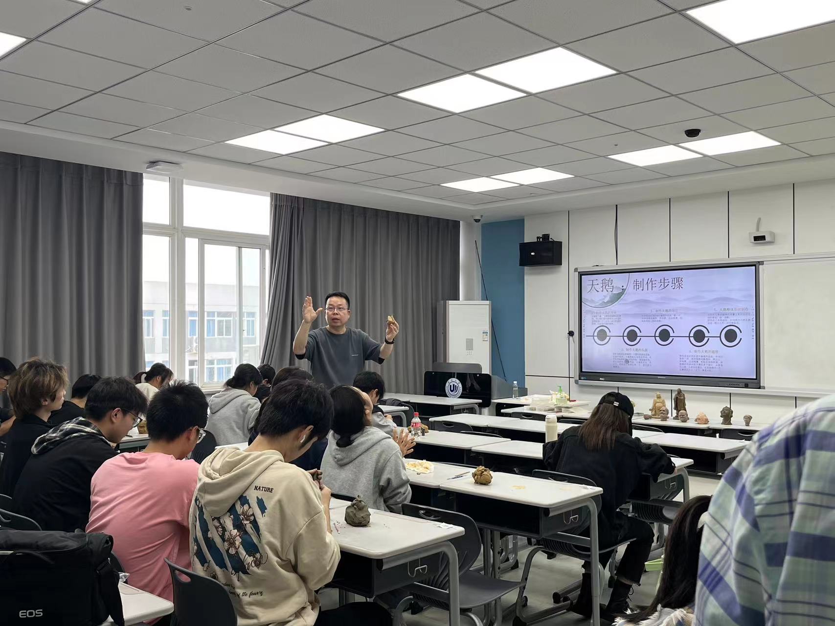 一个完整的泥塑作品要先进行创作构思,再绘制平面草图,随后经过拉、搓、揉、捏、压、插、接等一系列工序捏制出理想的塑像。在课堂上,叶芳林老师向同学们讲述了自己与“泥塑”的“缘分”。他说,“从初学艺至今,他已经痴迷泥塑创作30多年。”近年来,叶芳林老师的泥塑作品屡屡在全国获奖。