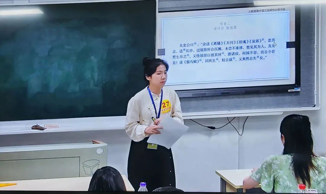 在比赛现场,孔佳妮同学自信从容、落落大方,展现出了作为一名温大优秀师范生的精神风貌。她抽到的课文是长篇文言文《屈原列传(节选)》。在授课过程中,她以课文第三自然段为支架,采用小组合作的方式——一人为朗读员,一人为讲解员,深入探究挖掘了文中屈原的形象及太史公对他的情感。孔佳妮同学通过多样的教学方法和细致深入的引导,很好地落实了“以学生为中心”的教育理念,将语文的工具性和人文性相统一,不仅激发了学生内心涌动的情感,更锻炼了他们的思维能力,课堂效果得到淋漓尽致的展现。