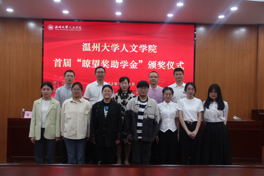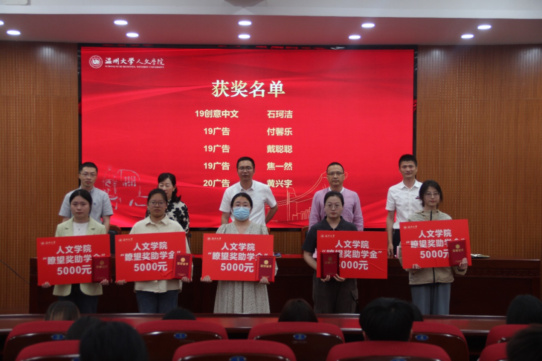 5月24日下午3时,温州大学球探体育 首届“瞭望奖助学金”颁奖仪式于人文楼203报告厅顺利举行,并借此向温州大学90周年华诞献上最诚挚的祝福。94届校友、“瞭望奖助学金”捐赠人廖文绍,96届校友蔡军令,温州大学学生工作部副部长王壮,球探体育 党委书记江秀景出席,获奖学生及学生代表100余人参加。活动由球探体育 党委副书记魏一主持。