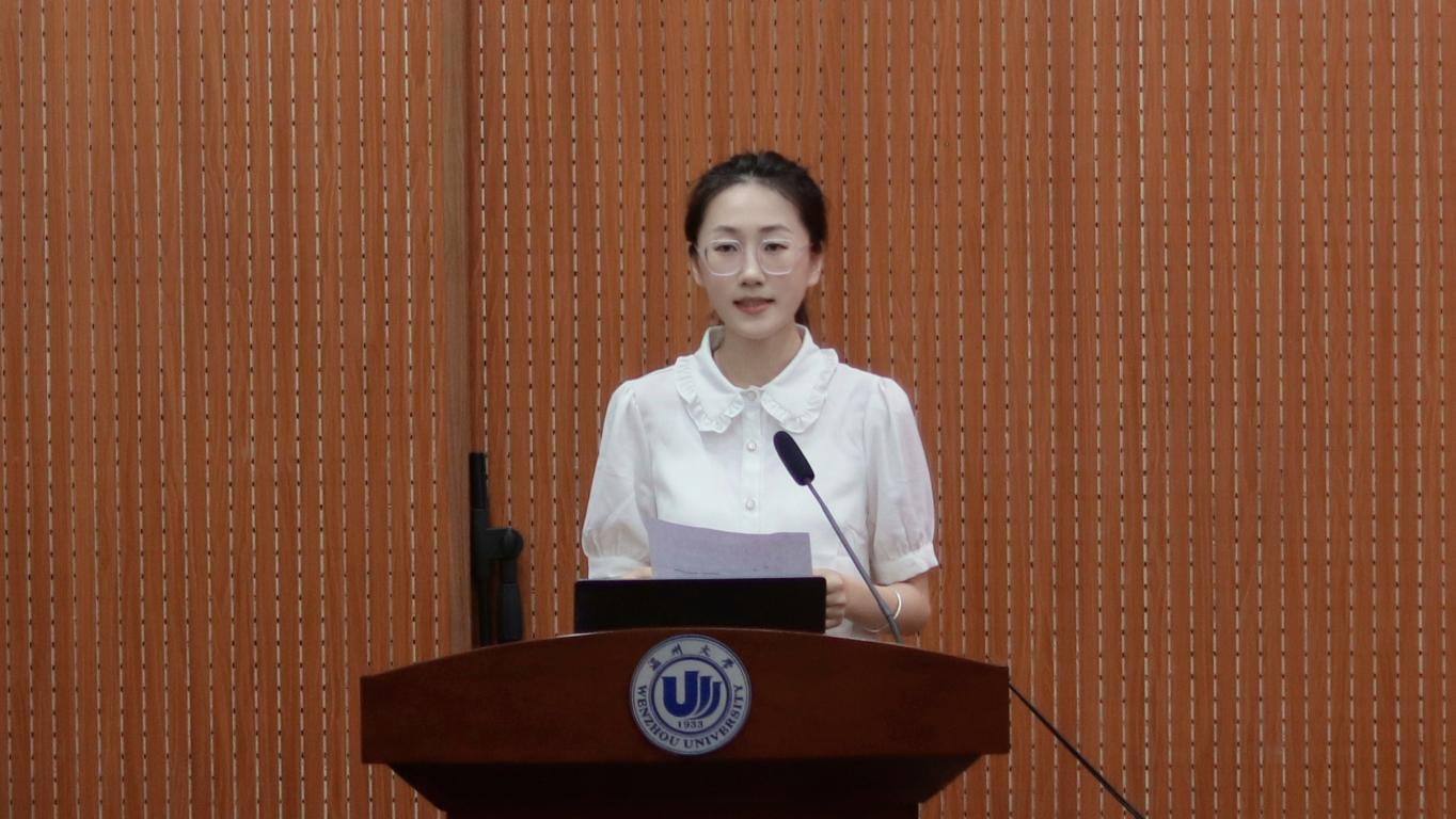 接下来由三位学生代表依次发言。首先,21学科教学(语文)专业的研究生章溢琦作为优秀党员代表发言,作为青年党员,要强理论、筑信念;争创新、勇追梦;践初心、担责任;当先锋、争先行;学用结合、勇于担当,努力为学院的党建工作做出贡献。