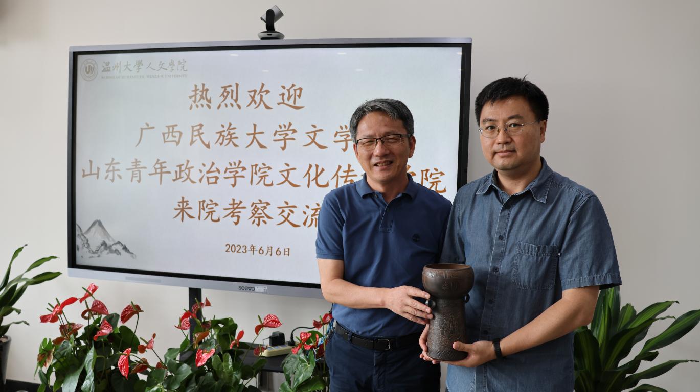 两所来访高校教师对球探体育 的热情接待和诚恳交流表示感谢,对球探体育 在学科建设与汉语言文学(创意中文实验班)的建设举措及取得的突出成绩表示赞赏。广西民族大学文学院向球探体育 捐赠了促进两院深入合作的纪念品。