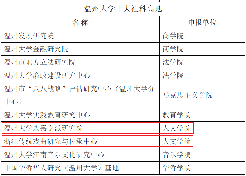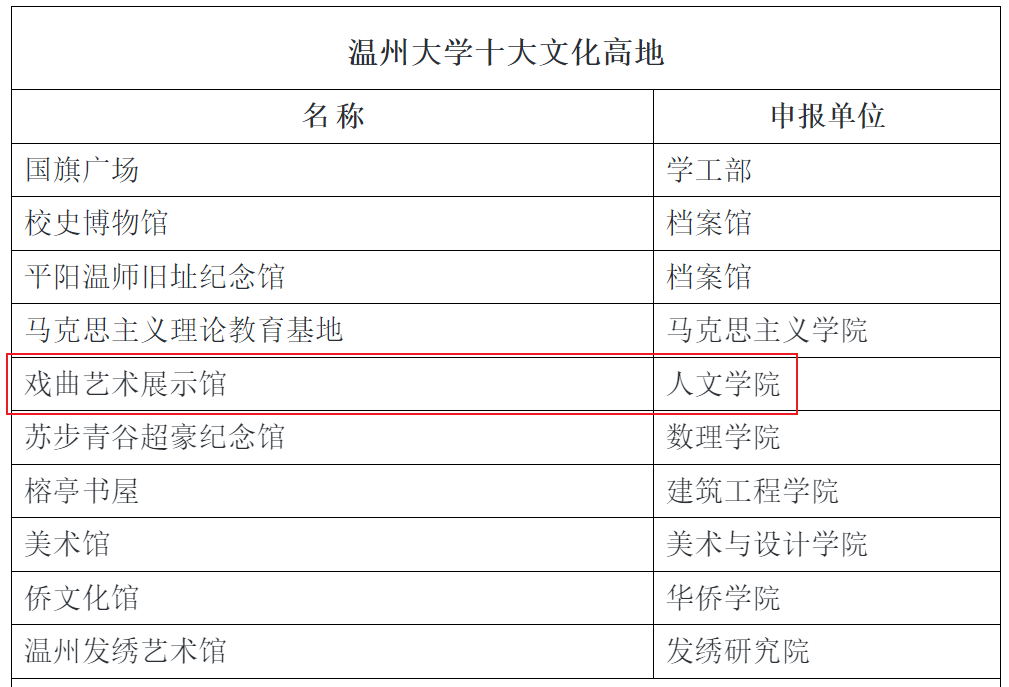 近日,经党委宣传部、科学技术处、人文社科处组织专家评审,温州大学公布了十大文化高地、十大科创高地、十大社科高地评选结果,球探体育 申报的浙江传统戏曲研究与传承中心、温州大学永嘉学派研究院入选温州大学十大社科高地,戏曲艺术展示馆入选温州大学十大文化高地。