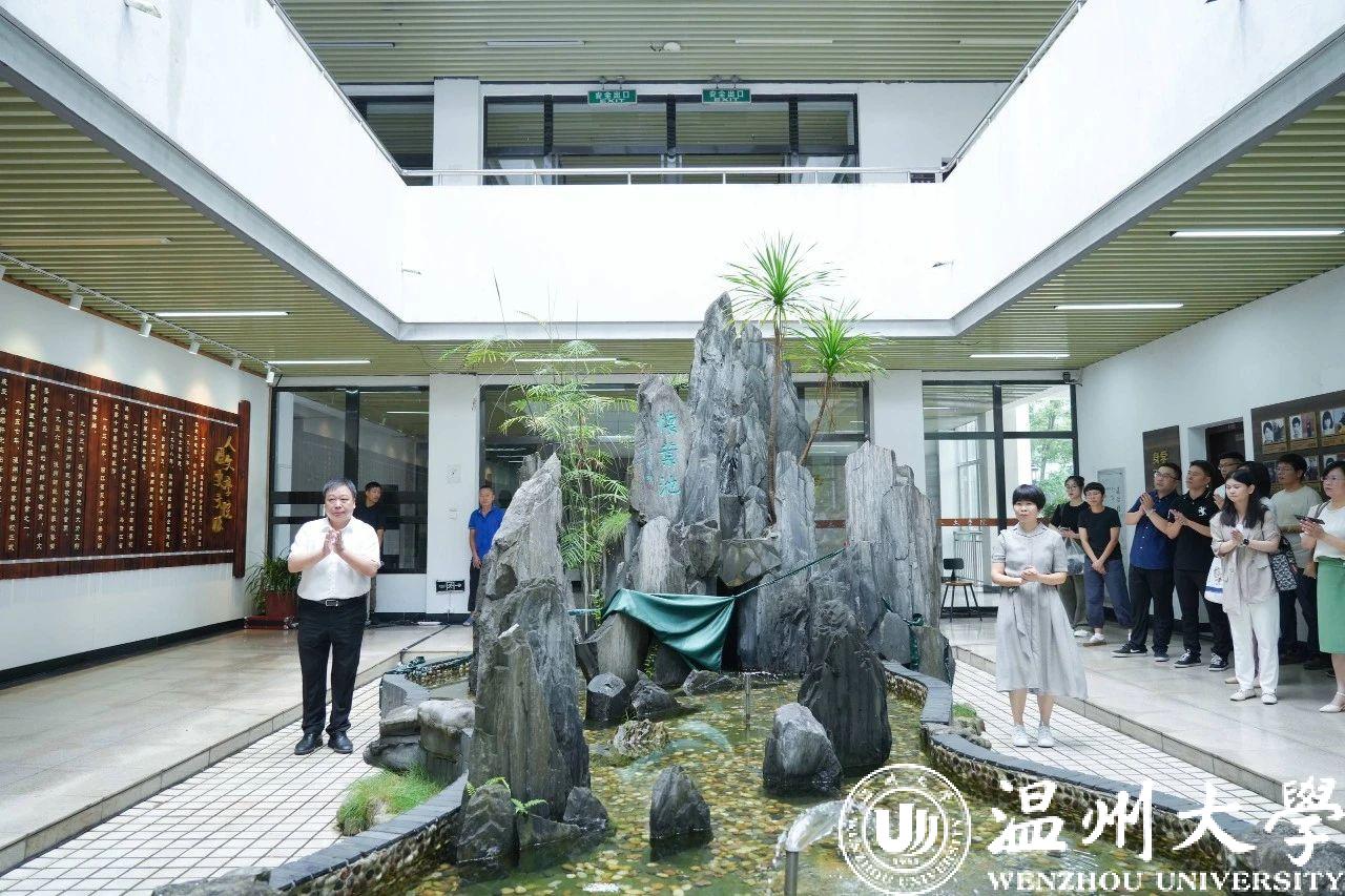在温州大学球探体育 党委书记江秀景的主持下,温州大学赵敏校长与叶世祥夫人吴健敏女士共同为学院一楼的怀叶池揭幕。据温州大学球探体育 院长孙良好教授介绍,“怀叶池”之所以被如此命名,既是以此来怀念叶世祥教授为温州大学尤其是球探体育 所作出的突出贡献,同时也有追怀永嘉学派之集大成者叶适之意。