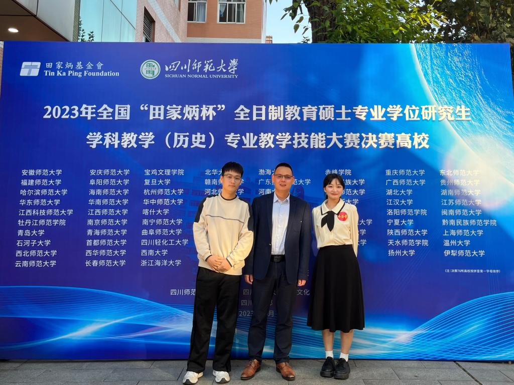 2023年10月21-23日,全国 “田家炳杯”全日制教育硕士专业学位研究生学科教学(历史)教学技能大赛决赛在四川师范大学举行。由陈勇副教授带队参赛的球探体育 学子取得了优异成绩,21级学科教学(历史)胡冷晴荣获二等奖、陈宇啸获优秀教学设计奖,蒋金崇教授获优秀指导教师奖。