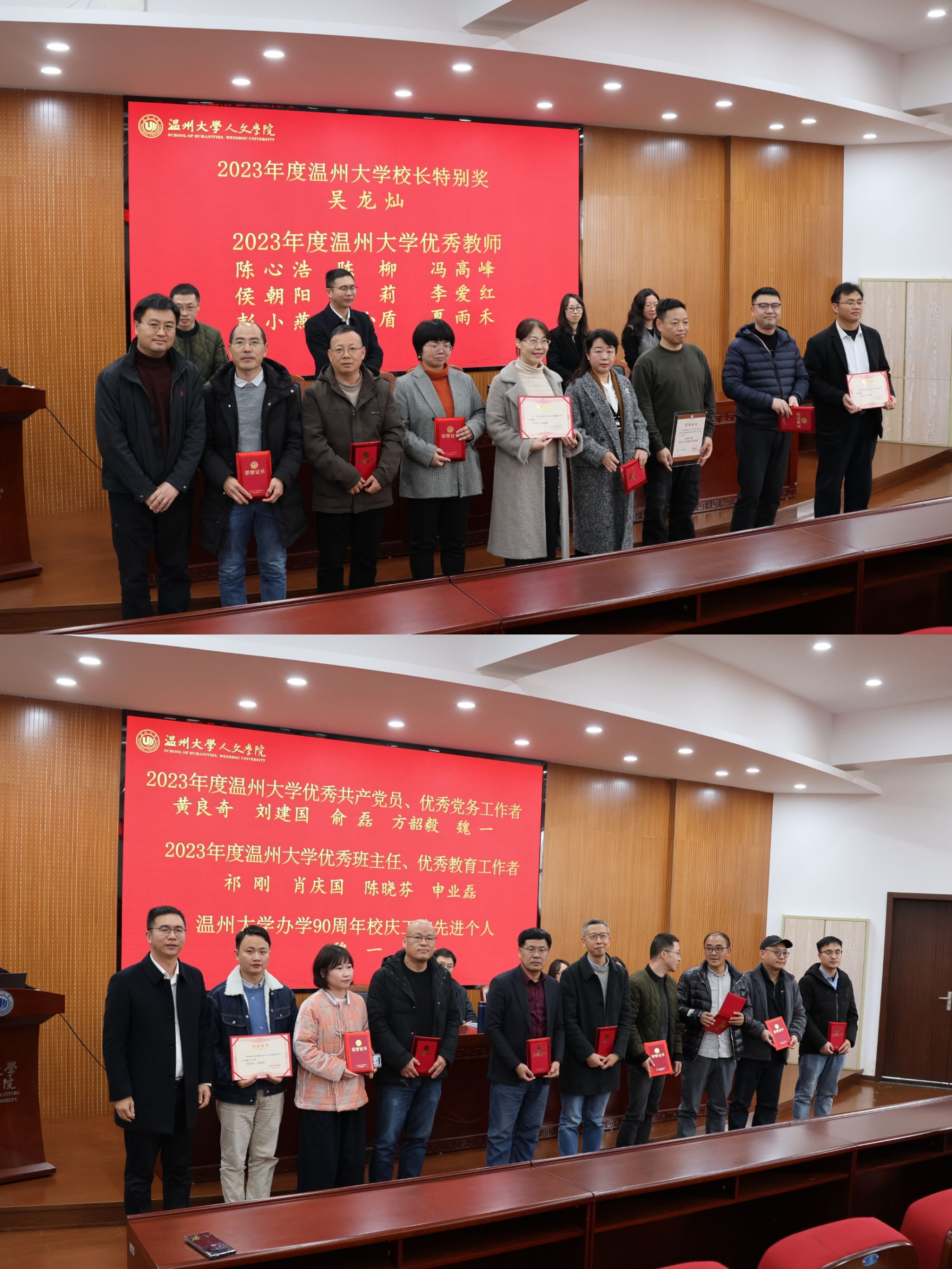 荣获2023年度温州大学各类奖项的教师名单,孙良好院长和江秀景书记分别对获奖教师进行了表彰,向他们表达了诚挚的祝贺。