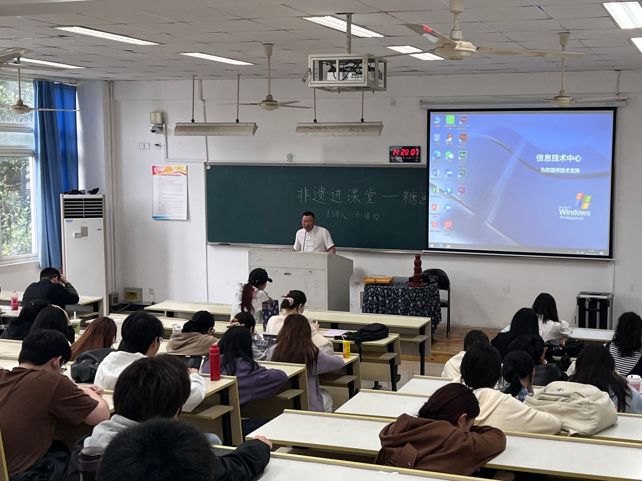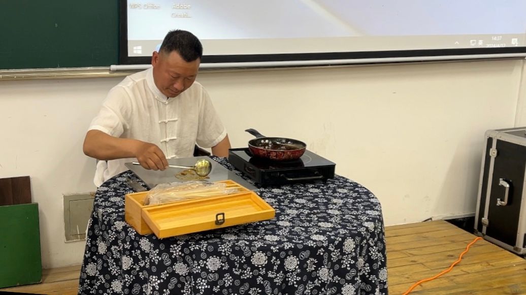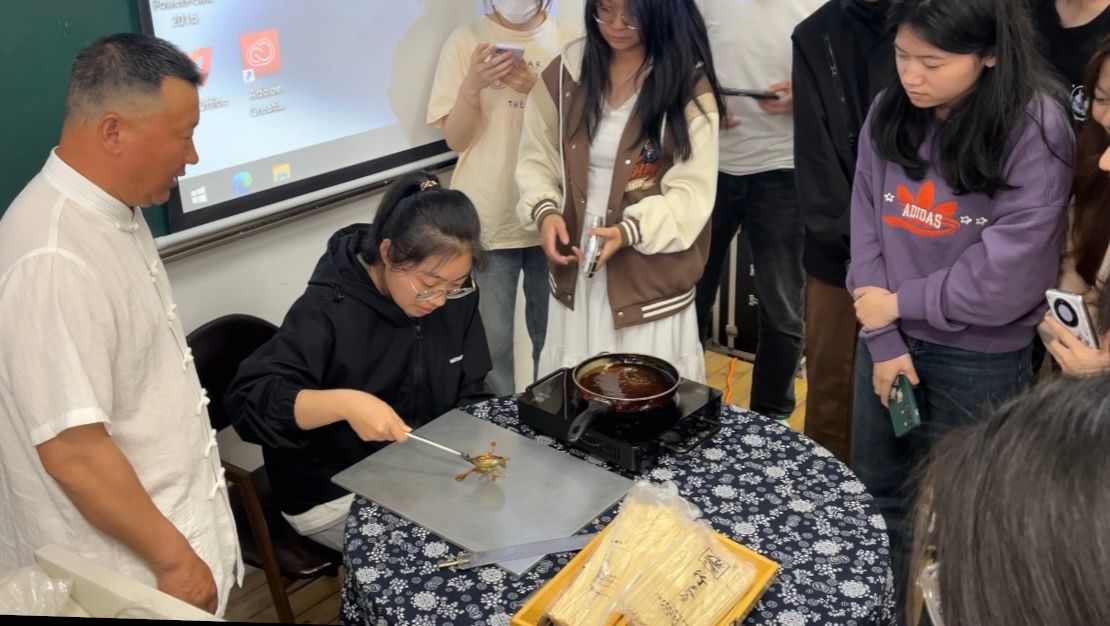 汤建妙老师站在讲台前,手持长勺,演绎着古老而迷人的糖画技艺。他熟练地操控着糖勺,轻轻舀起一勺晶莹剔透的糖液。通过精准的倒、提、顿、放、收等一系列动作,糖液在汤老师的巧手之下逐渐凝固成形。待糖液稍微冷却后,他迅速粘上竹签,再用铲刀轻轻铲起,一只栩栩如生、活灵活现的动物糖画便神奇地呈现在眼前。