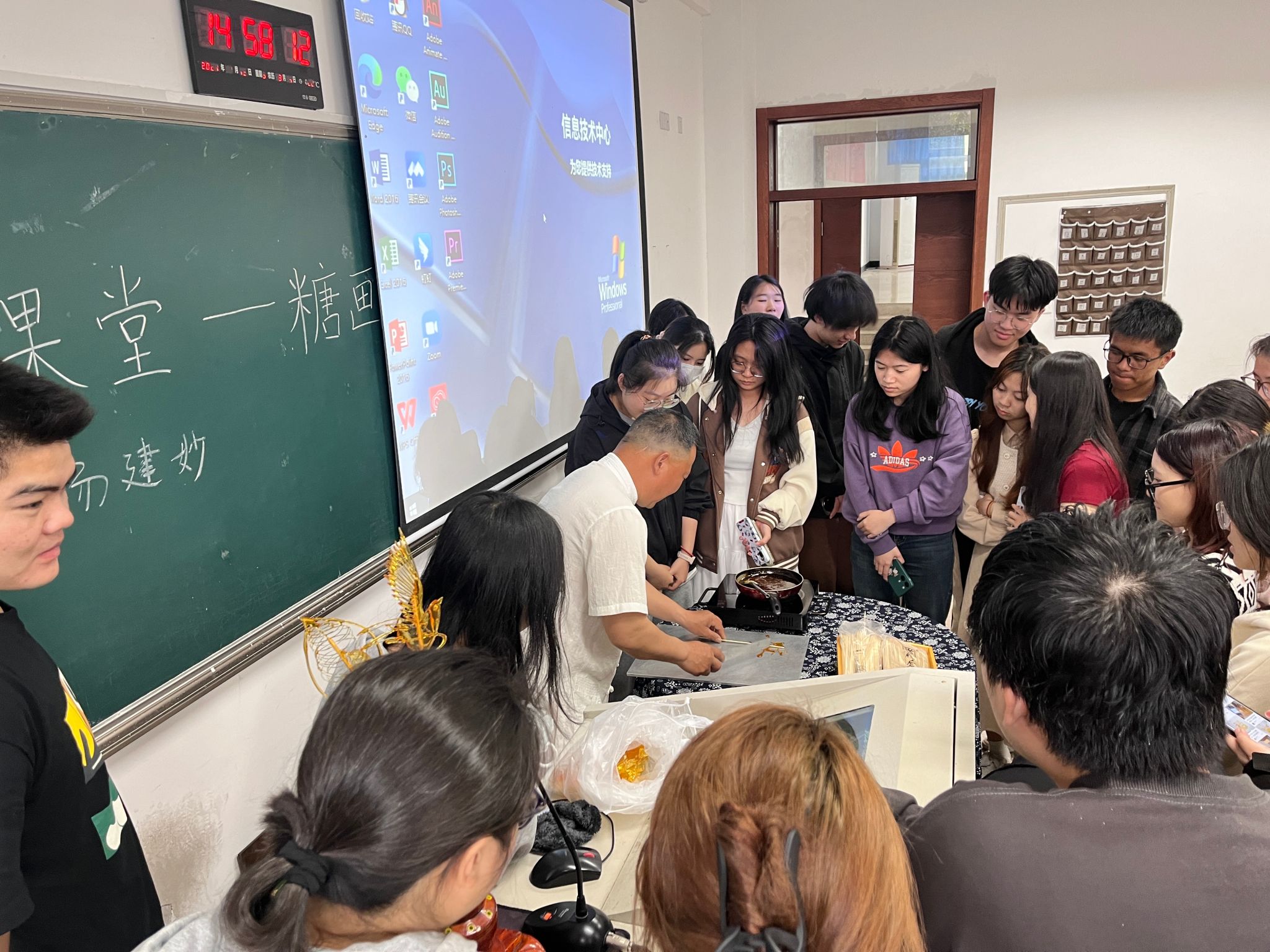 汤建妙老师在为同学们演示糖画的制作过程