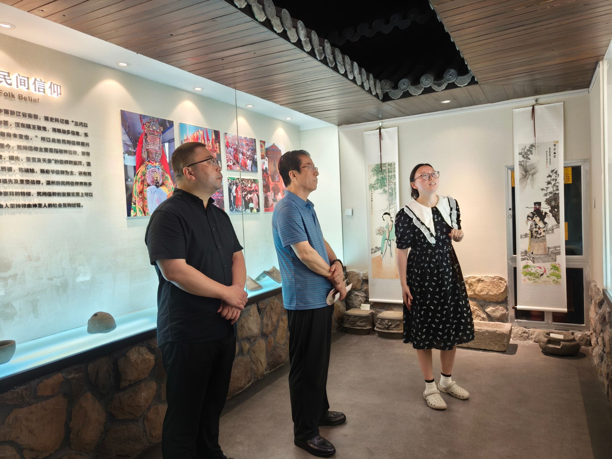 在参观国家语言文字推广基地期间,副院长陈源源为来宾重点介绍了学校语言文字工作的发展成果,展示了我校打造中华语言文字传承高地的愿景;副院长张真详细介绍了浙江传统戏曲研究与传承中心的建设历程、研究成果和社会服务等情况;民俗馆讲解员龙芳讲述了民俗博物馆的历史背景、古今城区的比较、各类民俗文物及文物背后的故事。参观过程中,马校长对馆内部分展品饶有兴趣地进行了讨论,高度肯定我校对国家通用语言文字、浙江传统戏曲及民俗文物保护和传承的重视。