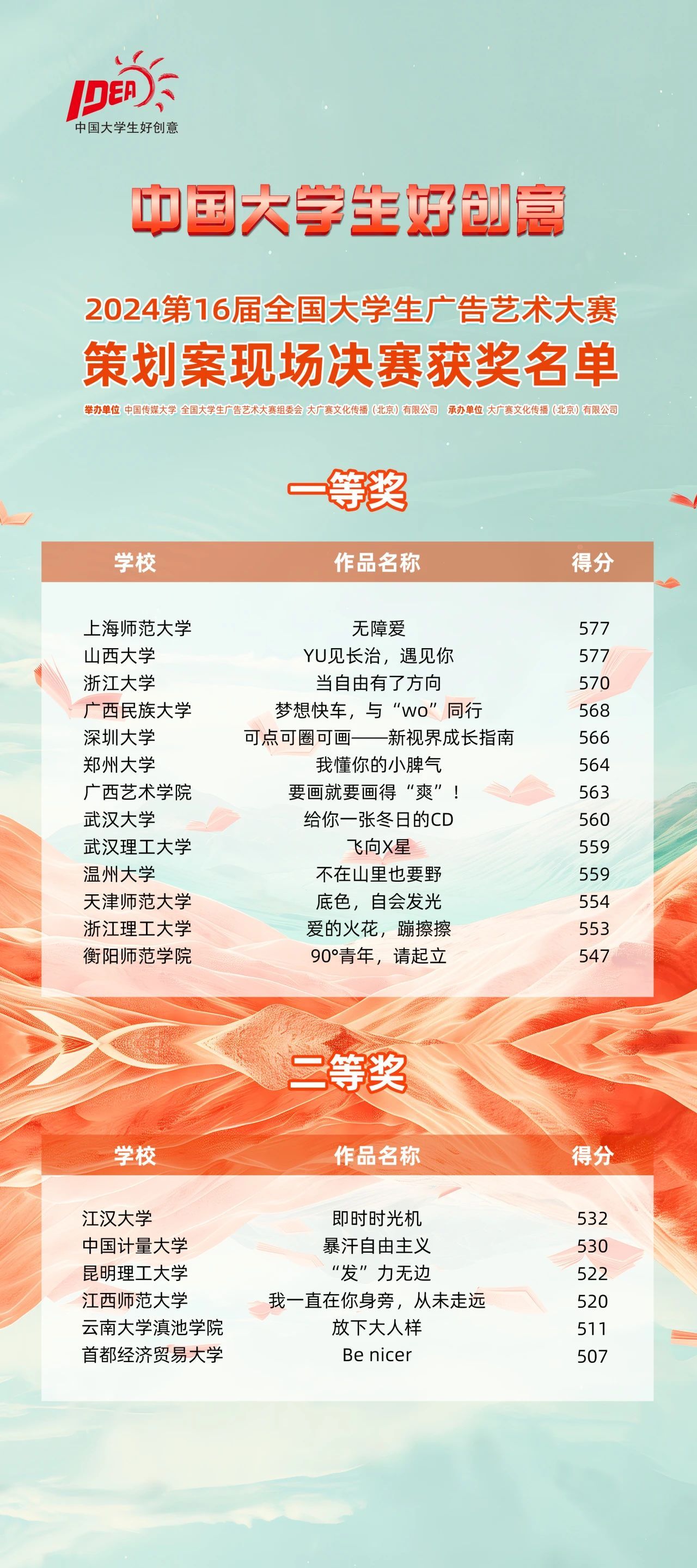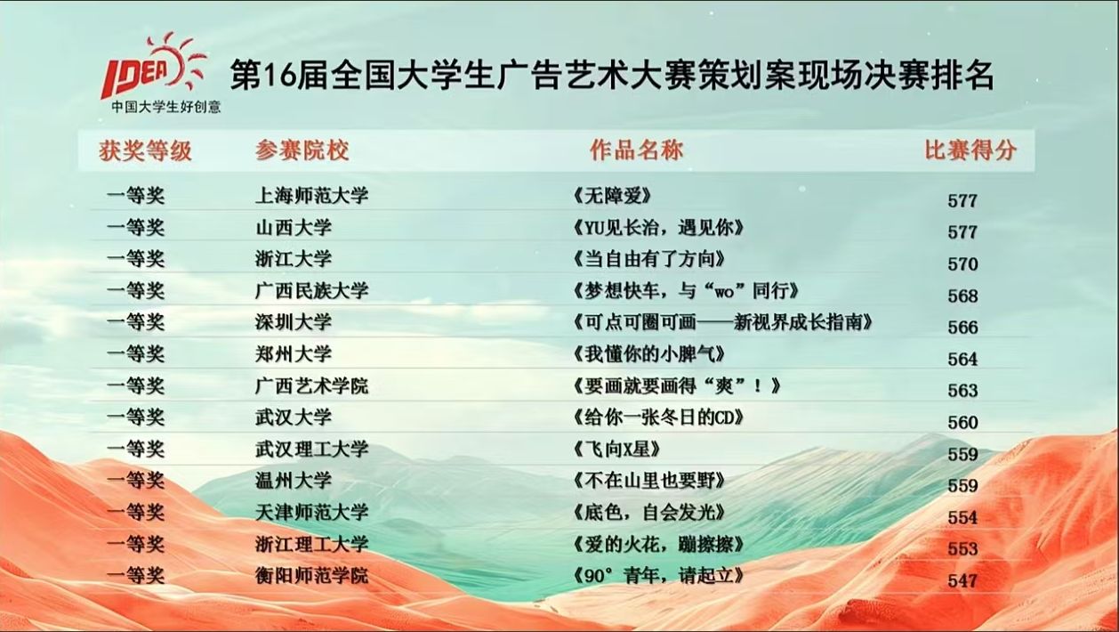 此外,温大广告学子在第16届全国大学生广告艺术大赛中还有一部策划案作品《做个“皮”孩子》(成员:刘怡婷、罗文奇、雷婉欣、李艺欣、刘洋)获得二等奖;两部作品《黑旋风爆改浪里白条》(成员:蔡夏蝶、陈熙妍、邱锰丹、毛家骏、魏开源)和《山》(成员:刘葛俊、马步千、曹凯、王皓天、潘炯尉)获得视频类三等奖;以及策划案《赤尾入境、让爱入境》(成员:程郁紫、吴恙玄铎、顾时雨、成莹、雷婉欣)、策划案《灵感有求,星火必应》(成员:东瑷昕、罗冰晶、卢琬璐、卢传娥、姚凯航)、广播《测谎仪》(成员:周婧、张诗琦、庞颖悦)、IP和创意周边《联通沃派、梦想第一站》(成员:吴奕祺、陆宇婧)四件作品获得优秀奖。