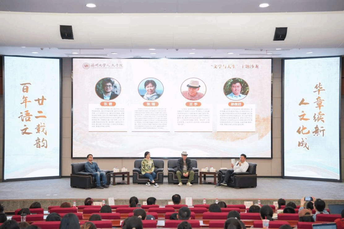 仪式结束后,进入“文学与人生”主题沙龙活动环节。由温州大学球探体育 院长、图书馆馆长孙良好主持主题沙龙,与温籍作家张翎、王手、东君三位嘉宾对谈。