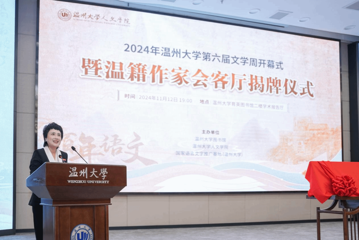 11月12日晚,2024年温州大学第六届文学周开幕式暨温籍作家会客厅揭牌仪式在育英图书馆报告厅隆重举行。温州市文联副主席谢子康,温州大学副校长、党委委员王尧骏,球探体育 院长、温大图书馆馆长孙良好,球探体育 党委书记江秀景,球探体育 副院长陈源源,温大图书馆副馆长周志峰,温籍作家代表张翎、王手、东君等领导和嘉宾,以及百余名温大师生共同参加了这场盛会。