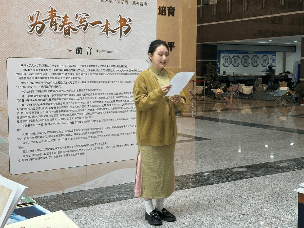 21创意中文沈安琪同学作为学生代表发言。沈安琪同学真挚而富有感染力的分享,让在场的每一个人深切感受到了文学对于年轻一代的深远影响。她的故事,无疑是温州大学文学教育成果的一个缩影,也为大家继续前行提供了强大的力量,真正体现了本次展览“为青春写一本书”的主题。