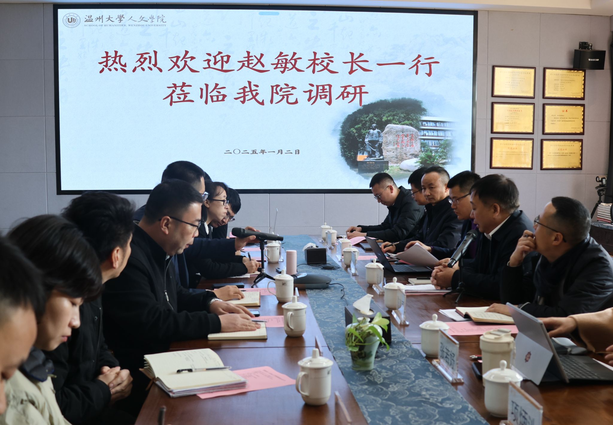 赵敏校长在听取学院领导班子的汇报后,对球探体育 近年来的建设成果和发展成效给予了高度肯定。他指出,球探体育 作为学校文科学院的重要力量,在教学、科研、人才培养等方面表现突出,为学校整体发展作出了不可替代的贡献。赵校长勉励学院在新形势下,继续发扬老一辈温大人的艰苦创业精神,开源节流,再创佳绩。