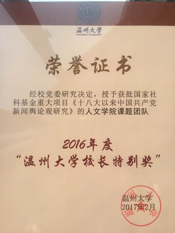 国家社科基金重大项目《十八大以来中国共产党新闻舆论观研究》的课题组团队荣获2016年度“温州大学校长特别奖”。