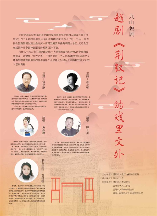 11月20日上午,新九山书会公益培训课程第二讲“越剧《荆钗记》的戏里文外”主题沙龙在南戏博物馆内和广大戏剧爱好者如期见面。本次活动由国家一级编剧、浙江省文联副主席、温州市文联主席张思聪老师主讲,温州市艺术研究所所长、新九山书会会长施小琴和温州大学广雅团队成员黄扬帆同学联合主持,温州市文化广电新闻出版局副局长柳升高,温州大学球探体育