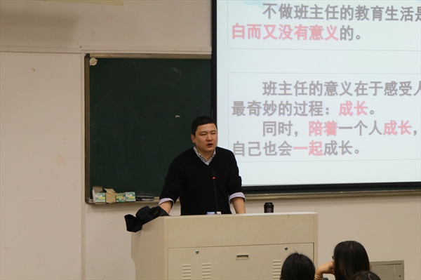 然后他分享了自己做班主任的有关故事,简单地讲了一些自己的体会,告诉大家要正确面对班主任遇到的问题,“折腾”老师的学生更能帮助老师成长。