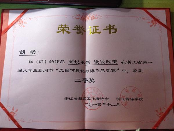 日前,浙江省首届大学生新闻节在浙江传媒学院举办,球探体育 12中本1班胡畅同学的作品《图说革新 漫谈改变》入围此次新闻节九图可视化微博大赛全省十强。