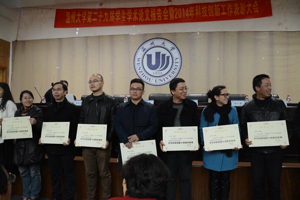 经学院推荐,“东海潮”创新奖励基金管理委员会评审,温州大学为10位同学和10位老师分别授予了“2014年大学生科技创新之星”、“2014年学生科技创新十佳指导教师” 荣誉称号。