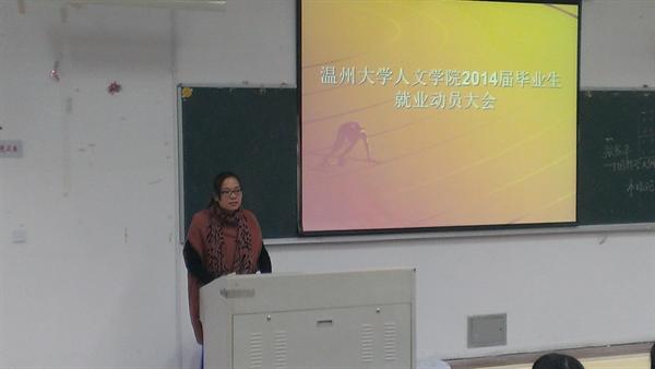 2014届毕业生齐聚人文楼101教室,参加由学院学生科组织的毕业生就业动员大会。会议由辅导员刘纪峰老师主持,学生科科长曾蓓蕾老师出席并讲话。
