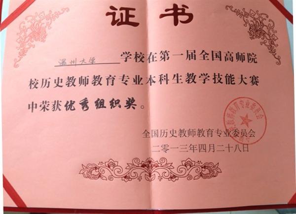 本次大赛共有来自34个学校参加,包括华东师范大学、西南大学、东北师范大学、陕西师范大学、华中师范大学五所部属师范大学以及二十多所省属重点师范院校百余位选手参与说课或讲课项目的角逐,球探体育 09历本沈芳,10历本张怡羚、陈政伊三位同学参加了比赛。经过现场的激烈争夺,我校选手在比赛中脱颖而出,成绩喜人。张怡羚荣获说课一等奖,沈芳荣获讲课二等奖,陈政伊荣获说课三等奖。同时,温州大学被授予“优秀组织奖”,是本次大赛总成绩很好的参赛单位之一。这一成绩的取得,与三位同学平时勤学苦练分不开,也离不开指导老师陈志刚、郑春生的悉心指导,更离不开学院领导的大力支持和帮助。希望她们在今后的日子不断超越自己,也希望历史学师范专业的同学汲取经验,再创佳绩!