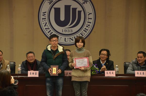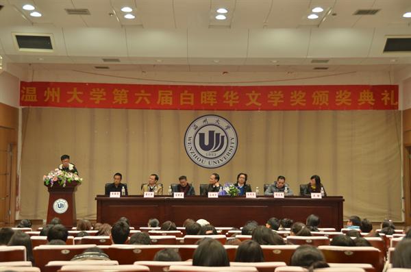 颁奖典礼在“白晖华文学奖的成长史”简介中拉开帷幕。短短几分钟的记录视频,讲述了白晖华文学奖从设立到发展的历史路程,向到场的嘉宾和同学们介绍白晖华文学奖的由来和概况,一篇篇优秀作品的回顾,展现了当代大学生的文学创作风貌和文学热情。随后,吴静书记为颁奖典礼致辞,对吴先生的资助表示感谢。在一阵热烈的掌声中,主办方派学生代表向白晖华文学奖的赞助人吴明华先生送上鲜花,以表谢意。吴先生起身致意,应邀发表讲话。吴先生通过自己的亲身经历,向同学们讲述了他对写作的体会感受和宝贵经验,鼓励同学们要怀有创作热情、坚持不懈,同时要增加阅历,以丰富作品内涵。吴先生的讲话诚恳真挚,令在场的同学们深受触动。随着蔡贻象院长宣读了获奖名单,出席的各位嘉宾领导为三十二位获奖者领奖,现场掌声雷动,这既是对获奖同学的鼓励,更是对自己的祝福,每一个同学的眼中都闪着希望的光,我们也期待以后有更多的文学创作爱好者能站上颁奖台。