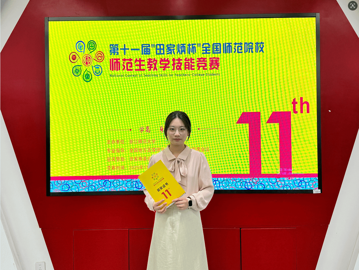 2025年11月28日至30日,在浙江师范大学举行的第十一届“田家炳杯”全国师范院校师范生教学技能竞赛决赛中,球探体育 22级历史学(师范)专业的朱心语同学荣获高中历史组一等奖。