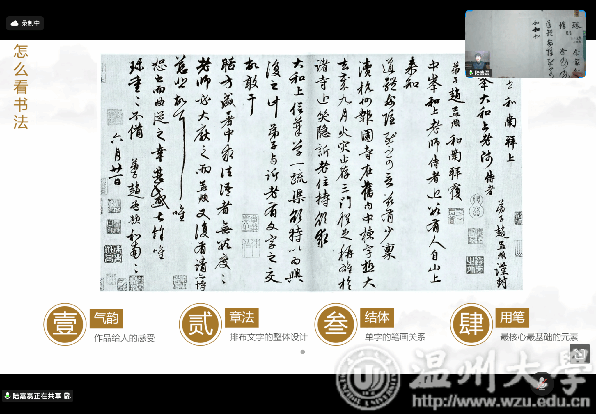 11月30日晚上,最后一场线上讲座由温州大学美术与设计学院讲师、中国美术学院博士、浙江省青年书法家协会篆刻委员会副秘书长陆嘉磊老师主讲,主题为“书法艺术的审美与书写——以赵孟頫为例”。