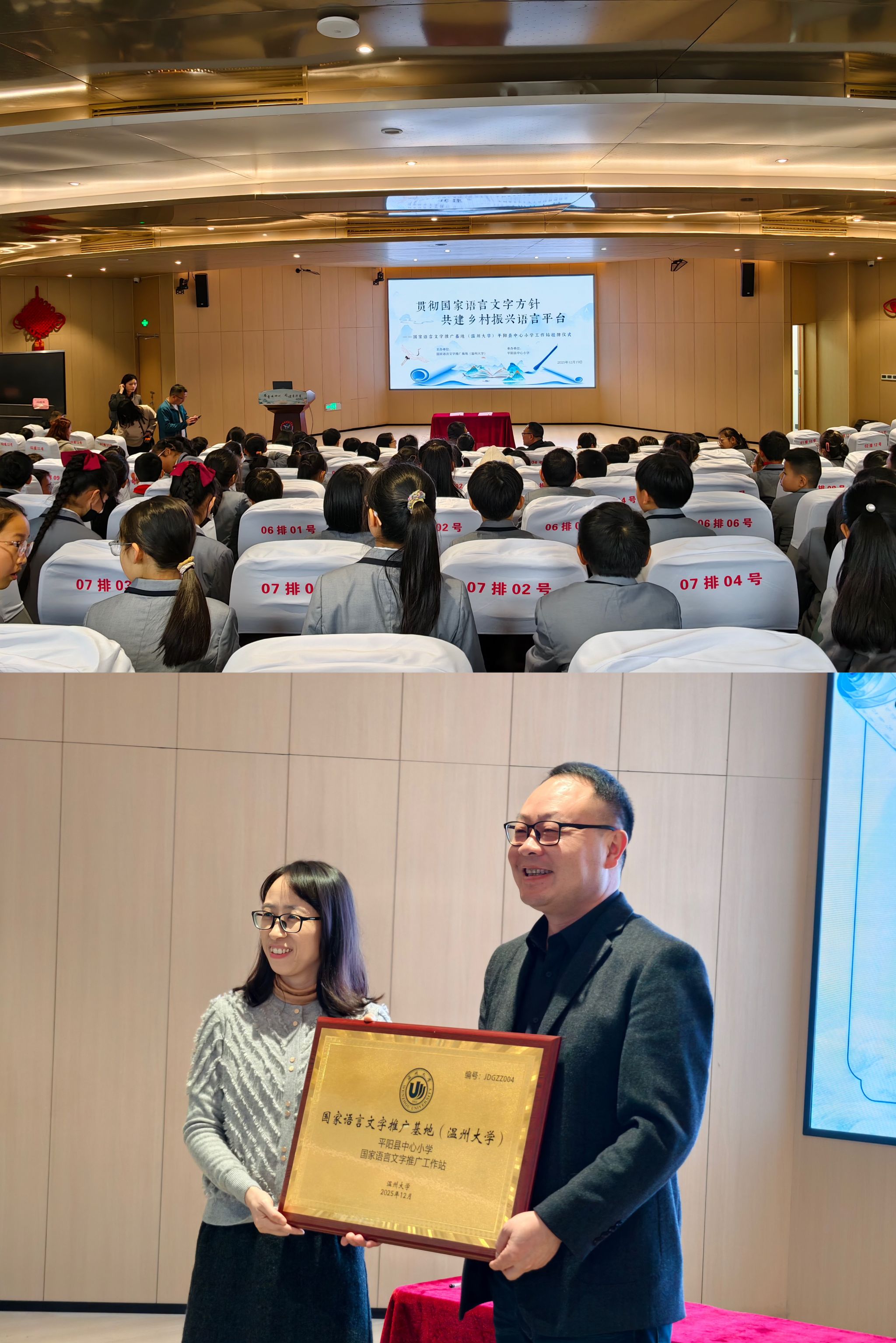 2025年12月19日,国家语言文字推广基地(温州大学)平阳县中心小学工作站成立挂牌暨球探体育 教工第三党支部与平阳县小党总支结对共建签约仪式在该校报告厅顺利举行。温州大学球探体育 党委书记江秀景,球探体育 副院长、国家语言文字推广基地(温州大学)执行主任陈源源,基地相关专家与教师代表,平阳县中心小学领导江盛盟、李庆财等班子成员与教师、学生代表,以及媒体记者百余人参加仪式。