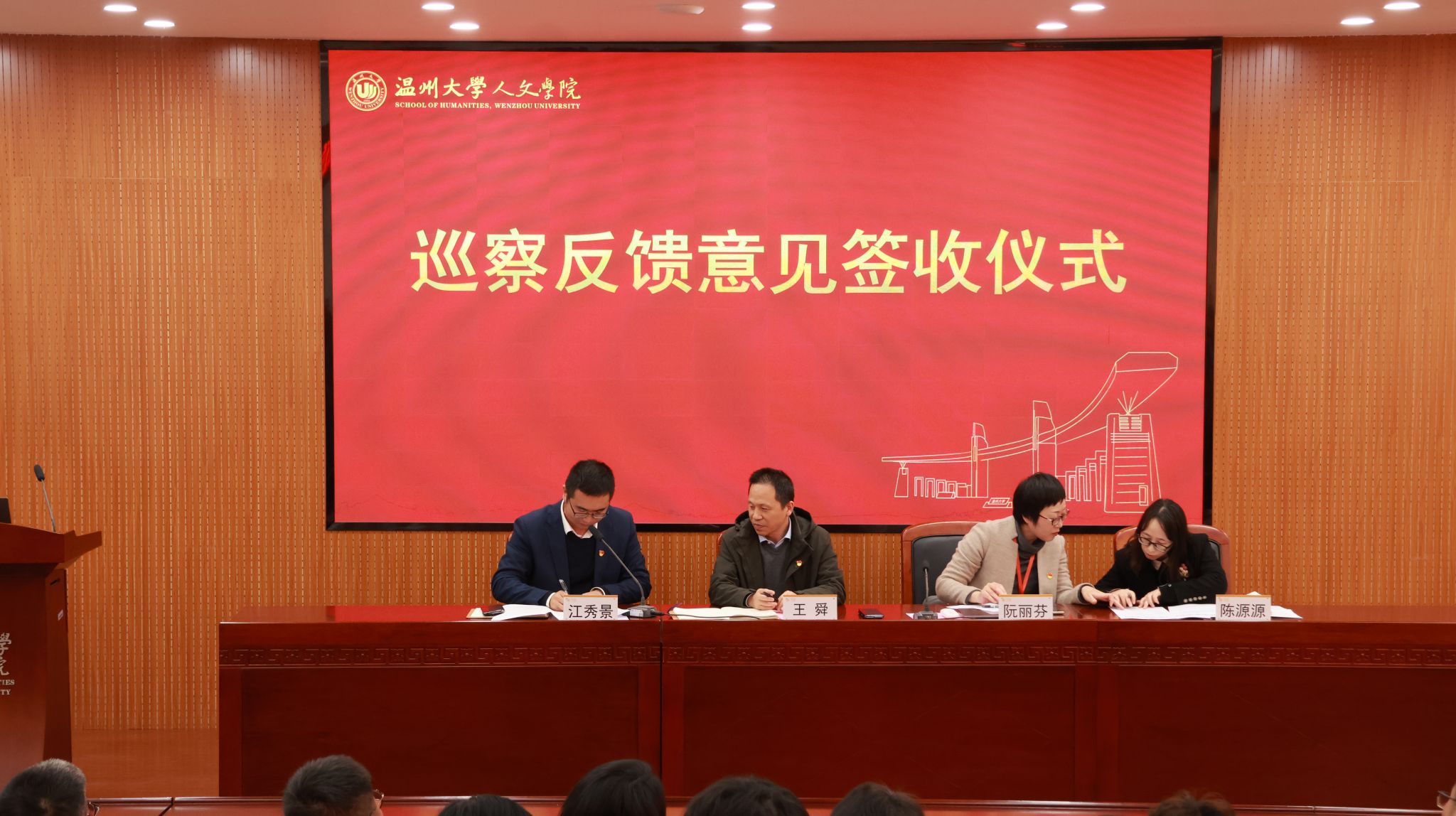 2026年1月14日下午13:00时,球探体育 在203会议室召开温州大学第三届党委第三轮巡察意见反馈会,会议由学院党委书记江秀景主持。王舜副校长、党委巡察办、党委组织部、巡察组,学院领导班子、全体教师参加此次会议。