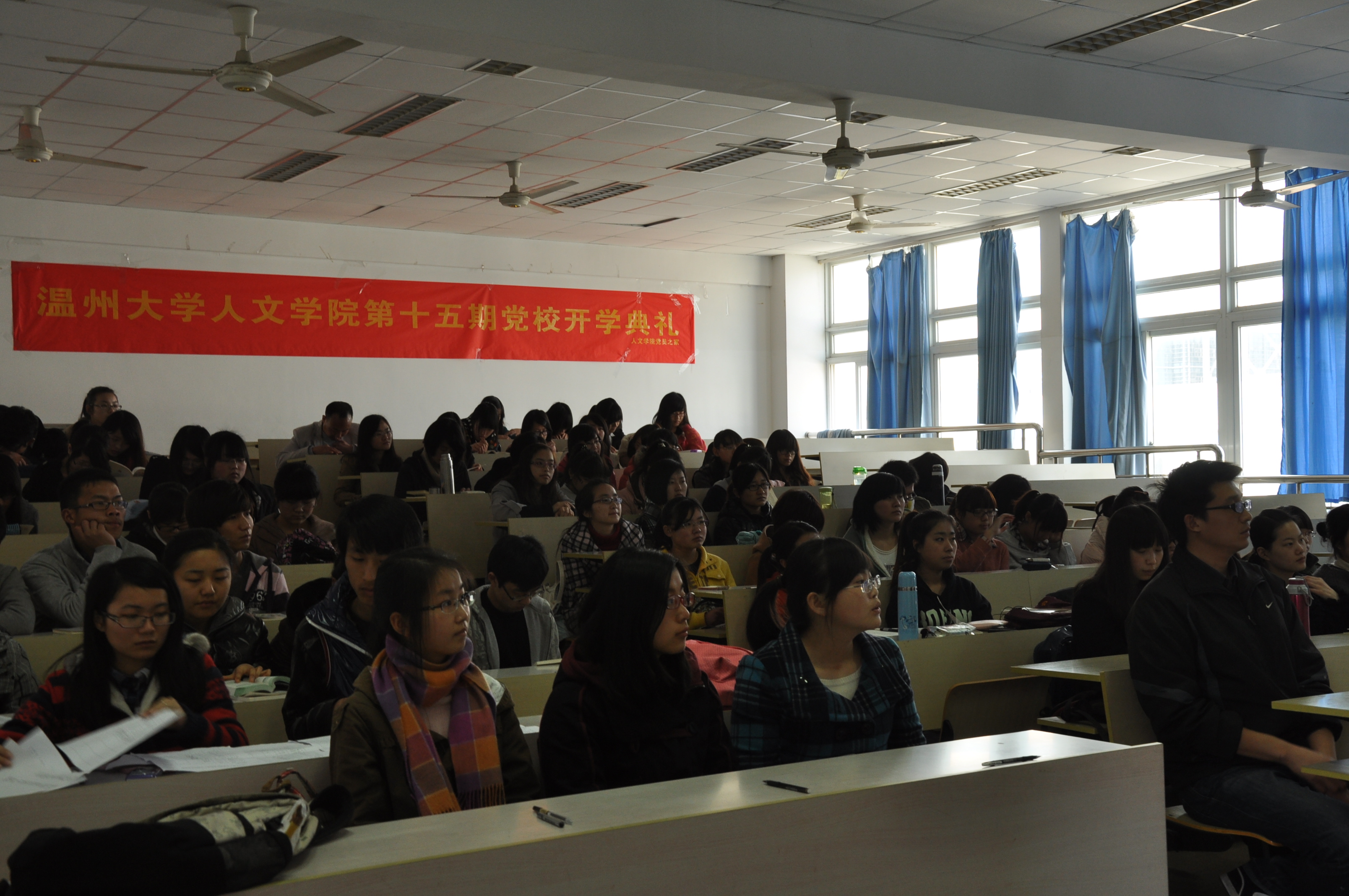 2012年3月21日下午14时,在北校区1-302教室举行了球探体育 第十五期党校开学典礼暨如何树立正确的入党动机讲座。出席开学典礼的有球探体育 党总支书记周剑平老师,球探体育 研究生辅导员刘纪峰老师,以及51名预备党员和77名党校学员。